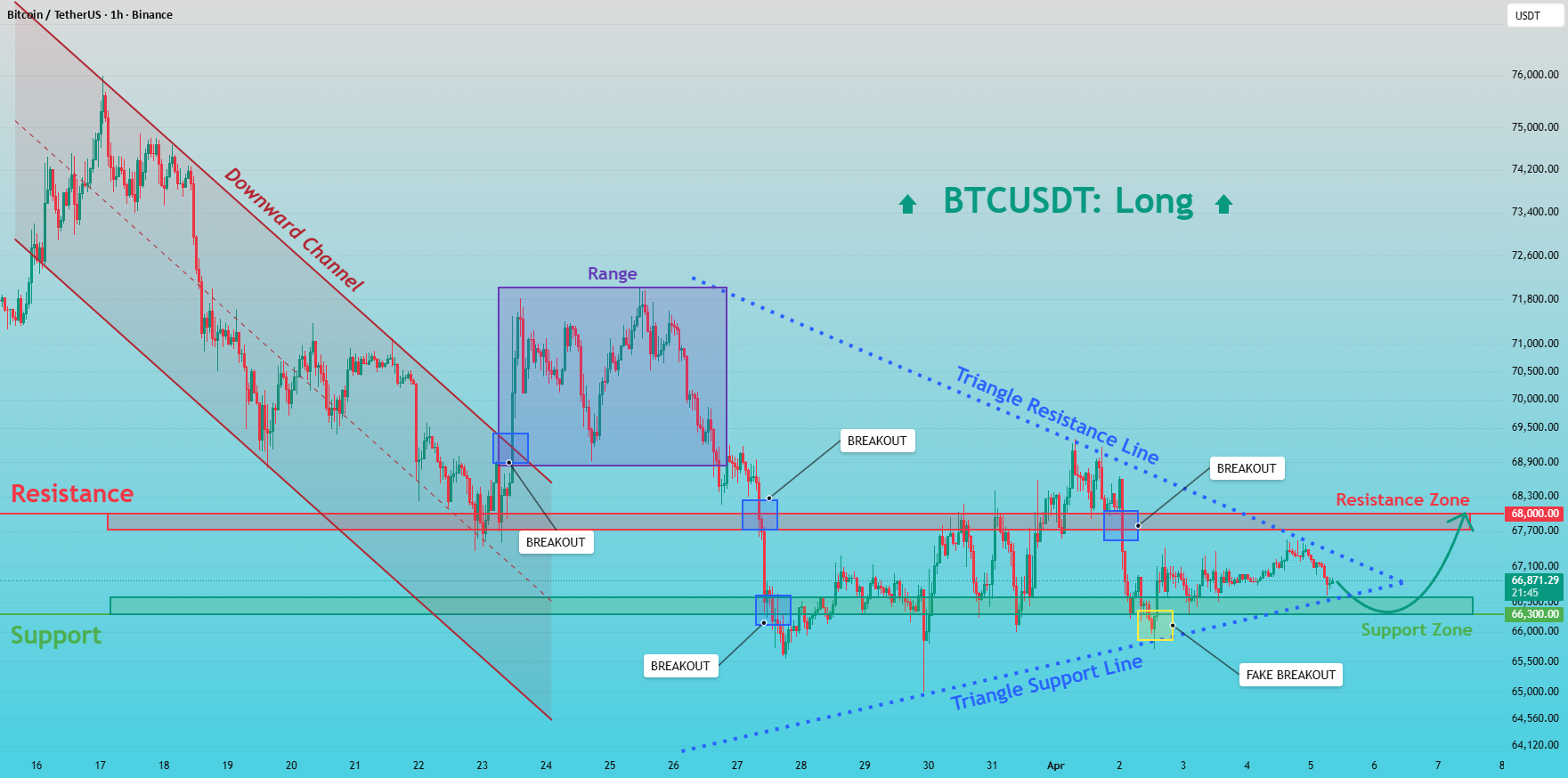 随后,市场形成了一个三角形整理结构,价格在下降阻力线和上升支撑线之间不断压缩。目前,价格正接近68000美元的阻力区域,同时保持在66300美元的支撑区域上方,结构逐渐收紧。