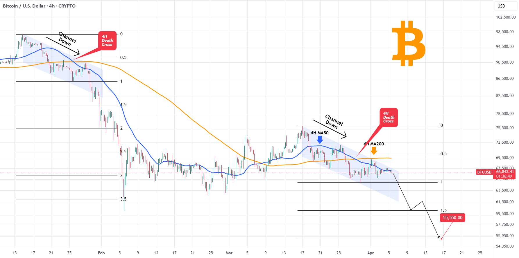 自3月17日的局部高点以来,比特币(BTCUSD)一直处于下行通道中。仅一周前,比特币在4小时图上形成了一个“死亡交叉”。这一形态上次出现是在1月25日,当时比特币正处于上一个下行通道中,并随后引发了急剧下跌,标志着熊市周期的第二波下跌。